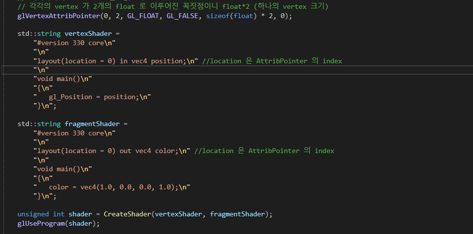 이전 글에서 설명했드시 쉐이더는 gpu 에 존재하는 프로그램(코드)이며 Vertex Buffer 를 이용해 넘겨받은 데이터를