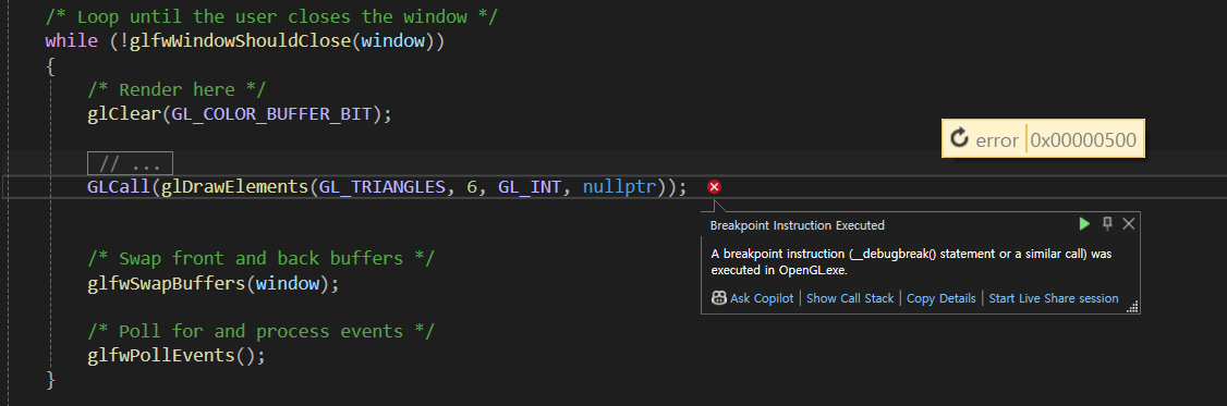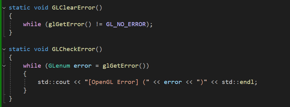 그리곤 이제 gl 함수들을 부를때마다 GLCall 에 감싸서 부르기만하면 어디서에러가 떴는지 확인할 수 있다.