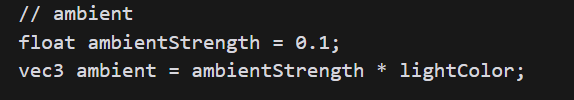 - Ambient lighting: 어두운 때일지라도 일반적으로 world의 어딘가엔 어떠한 조명이 존재(달, 멀리 떨어져 있는 조명)하므로 오브젝트는 대부분 완전히 어두워지지 않는다. 이를 위해 항상 어느정도 밝기를 유지하도록 ambient 조명 상수를 사용한다.