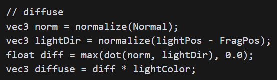lightDir 은 조명의 위치에서 프라그먼트 즉 면의 위치를 빼서 벡터를 만들어 광원의 벡터를 만들어준다.