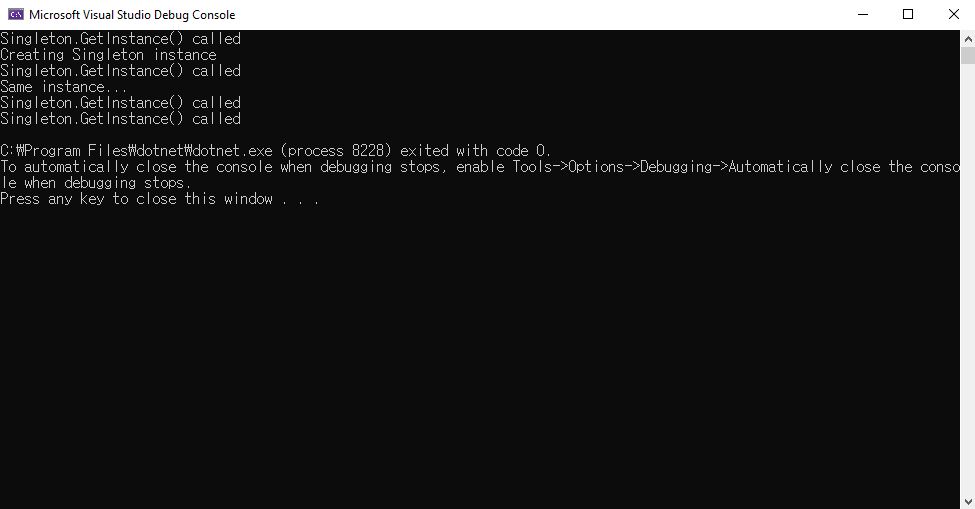 : 객체의 인스턴스를 오직 하나만 갖게 하기 위한 패턴. To make a class only have one instance.