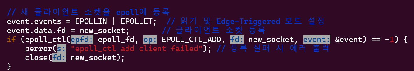 - EPOLLET은 Edge-Triggered 모드를 활성화합니다.