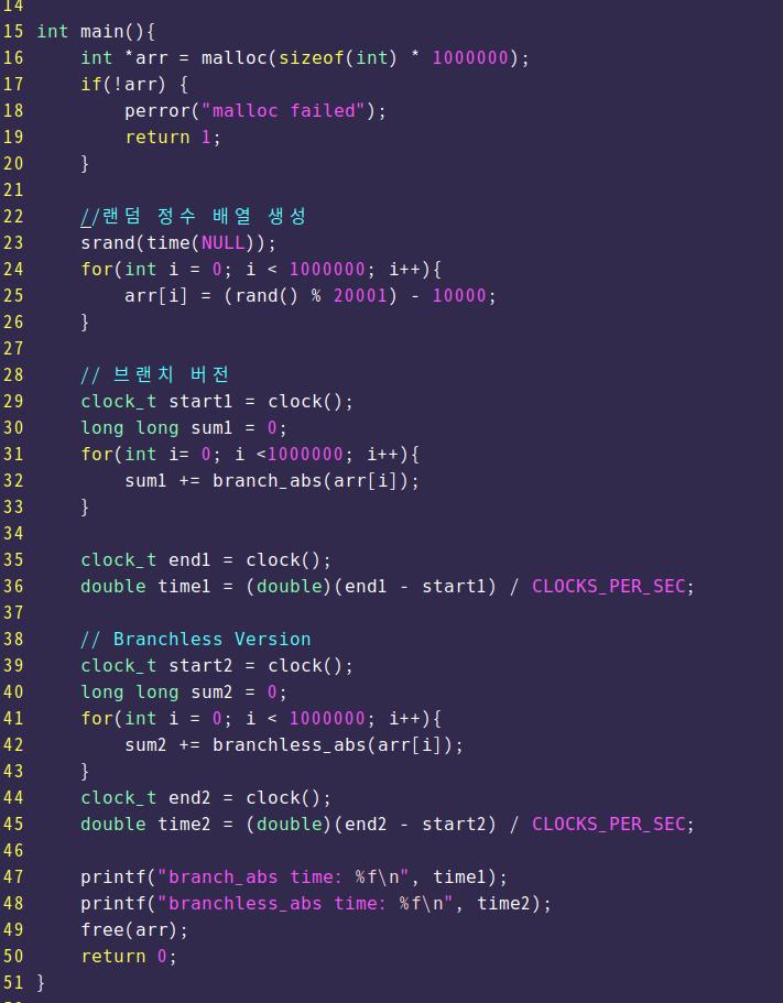 위와 같이 branched abs function 과 branchless abs function 두개를 만들어서 clock 함수로 시간측정을 해보겠다.