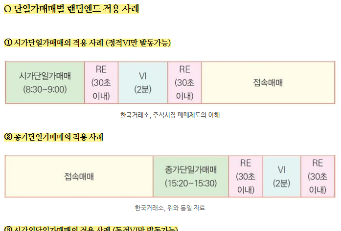 이후 VI 발동여부를 체크하여 발동조건을 충족하면 2분간 단일가 매매 후 다시 랜덤엔드 방식으로 종료.