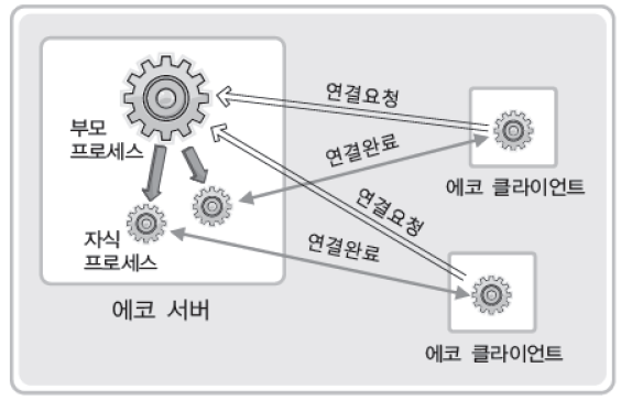서버는 클라이언트가 연결을 요청할 때마다 이를 수락함과 동시에 자식 프로세스를 생성하여 일을 처리하게끔 한다. 서버의 자식 프로세스는 넘겨받은 파일 디스크립터와 같은 정보를 바탕으로 일을 처리한다.